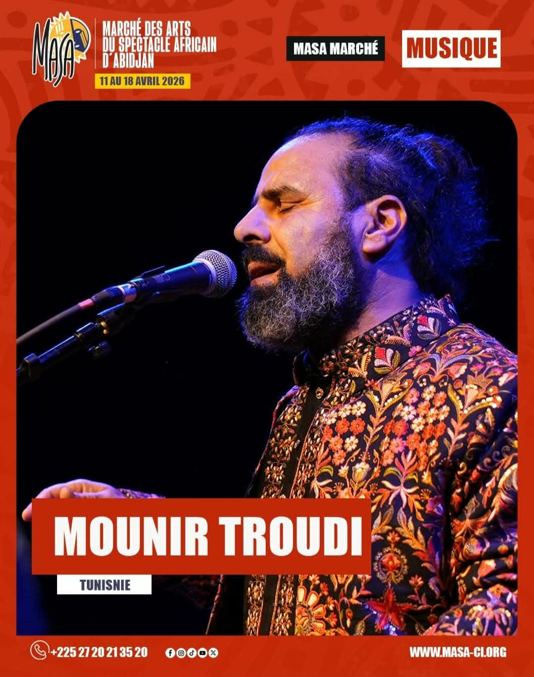 يستعدّ الفنان التونسي منير الطرودي للمشاركة بعرضه الموسيقي “ميزان” ضمن فعاليات الدورة الرابعة عشرة من التظاهرة الدولية سوق الفنون الأدائية ” MASA” التي تُقام من 11 إلى 18 أفريل 2026 بـالكوت ديفوار حيث يقدّم عرضه يومي الثلاثاء 14 والأربعاء 15 أفريل 2026 بمدينة أبيدجان.