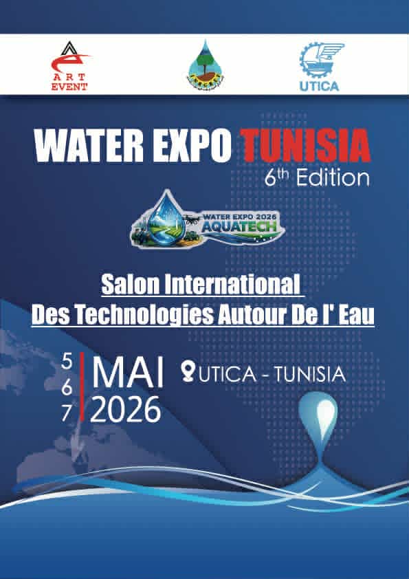 تحت إشراف وزارة الفلاحة والموارد المائية والصيد البحري ، تنظّم شركة ART EVENT بالشراكة مع المعهد الوطني للبحوث في الهندسة الريفية والمياه والغابات INRGREF، فعاليات الدورة السادسة من الصالون الدولي للأنشطة والتكنولوجيات المائية “WATER EXPO TUNISIA 6.0”، وذلك أيام 05 و06 و07 ماي 2026 بمقرّ الاتحاد التونسي للصناعة والتجارة والصناعات التقليدية UTICA.